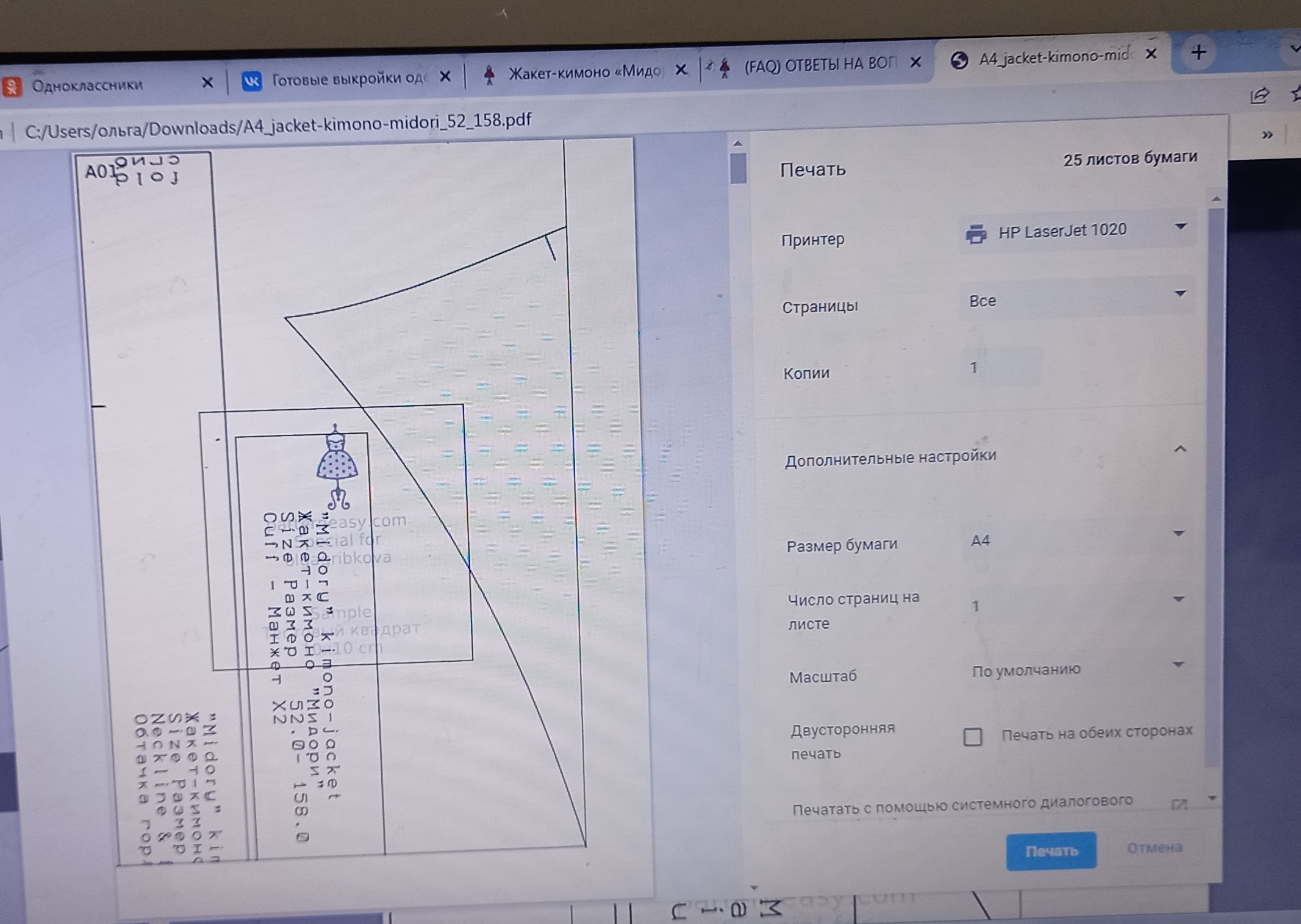 Здравствуйте! Пожалуйста, не печатайте через браузер компьютера, через него невозможно нормально настроить :( Откройте выкройки и выполните настройки печати в программе Adobe Reader.