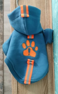 Забавный собакен. Наверняка вызывает восхищение в таком одеянии у прохожих на улице.