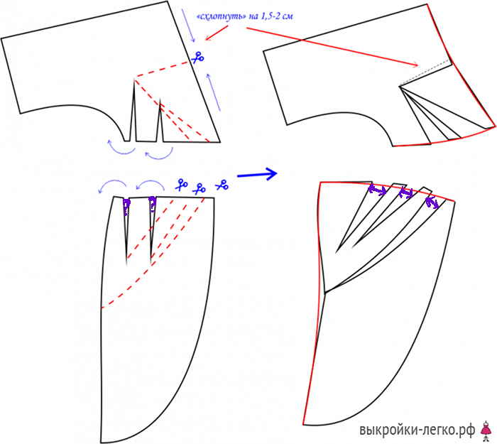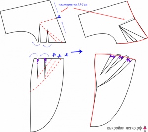 Здравствуйте, разводить части выкройки для получения складок/ драпировок лучше всего ориентируясь на свойства ткани, ее толщину, упругость, возможно см 7-10. Точную цифру к сожалению я не смогу сказать, все зависит от вашей ткани и вашей задумки и фигуры. Второй вопрос: вытачки закладываем в складки