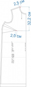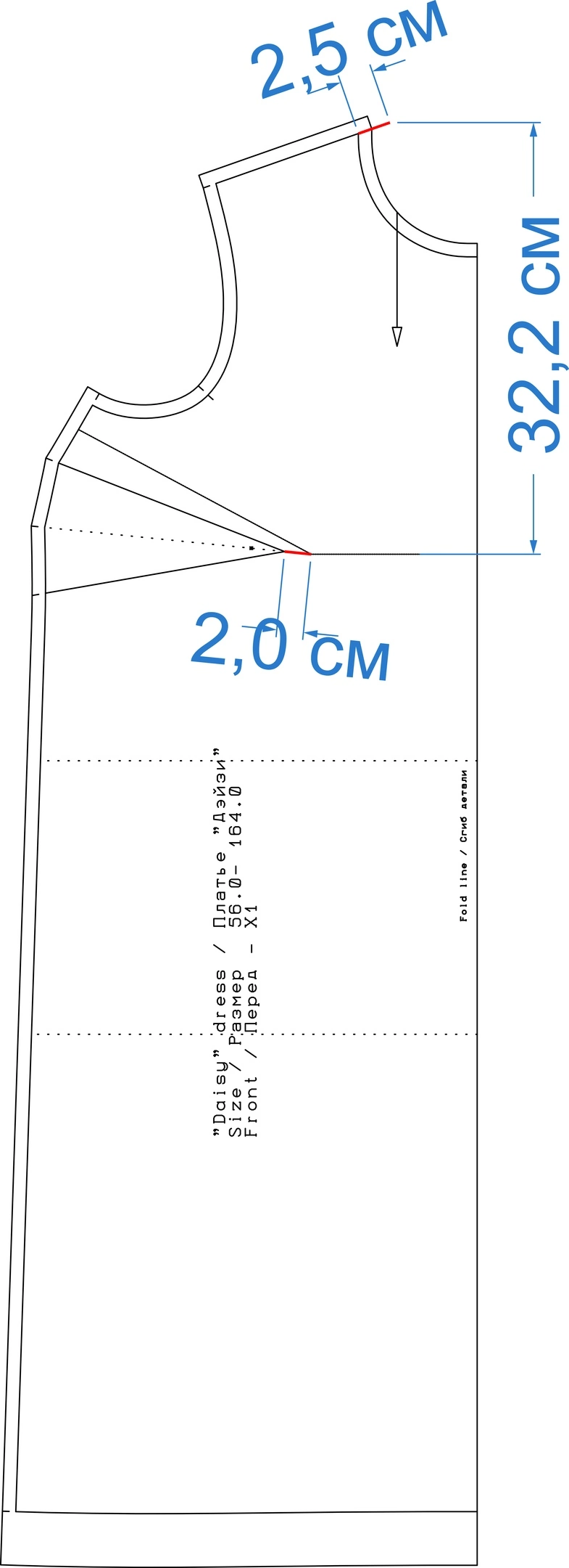 Здравствуйте, Ольга! По нашей размерной сетке мерка "Высота груди" в этом размере равна 32,2 см. Горловина расширена на 2,5 см, поэтому, чтобы проверить соответствие выкройки размерной сетке, нужно продлить линию плеча в сторону горловины на 2,5 см и производить измерение от этой точки до линии груди (она нанесена на выкройке). Должно получиться ровно 32,2 см. Кроме того, вытачка укорочена на 2 см - это стандартный прием при переводе нагрудной вытачки к боковому шву, это делается, чтобы ткань не торчала конусом на груди. На высоту вытачки это практически не влияет - наоборот, ее вершина становится за счет этого только выше, правда, всего на 2 мм.