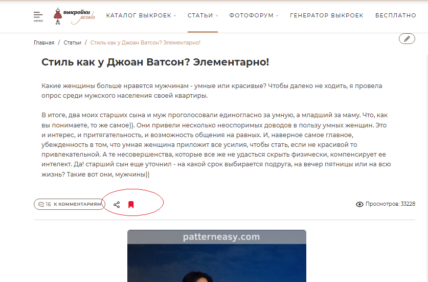 Добрый день! Вот она https://patterneasy.com/article/stil-kak-u-dzhoan-vatson-elementarno (скопируйте ссылку и вставьте ее в строку браузера). Как добавить статью в закладки: 1) нажмите на флажок на странице статьи; 2) избранные статьи смотрите в личном кабинете на вкладке «Избранное» (см. скриншоты)