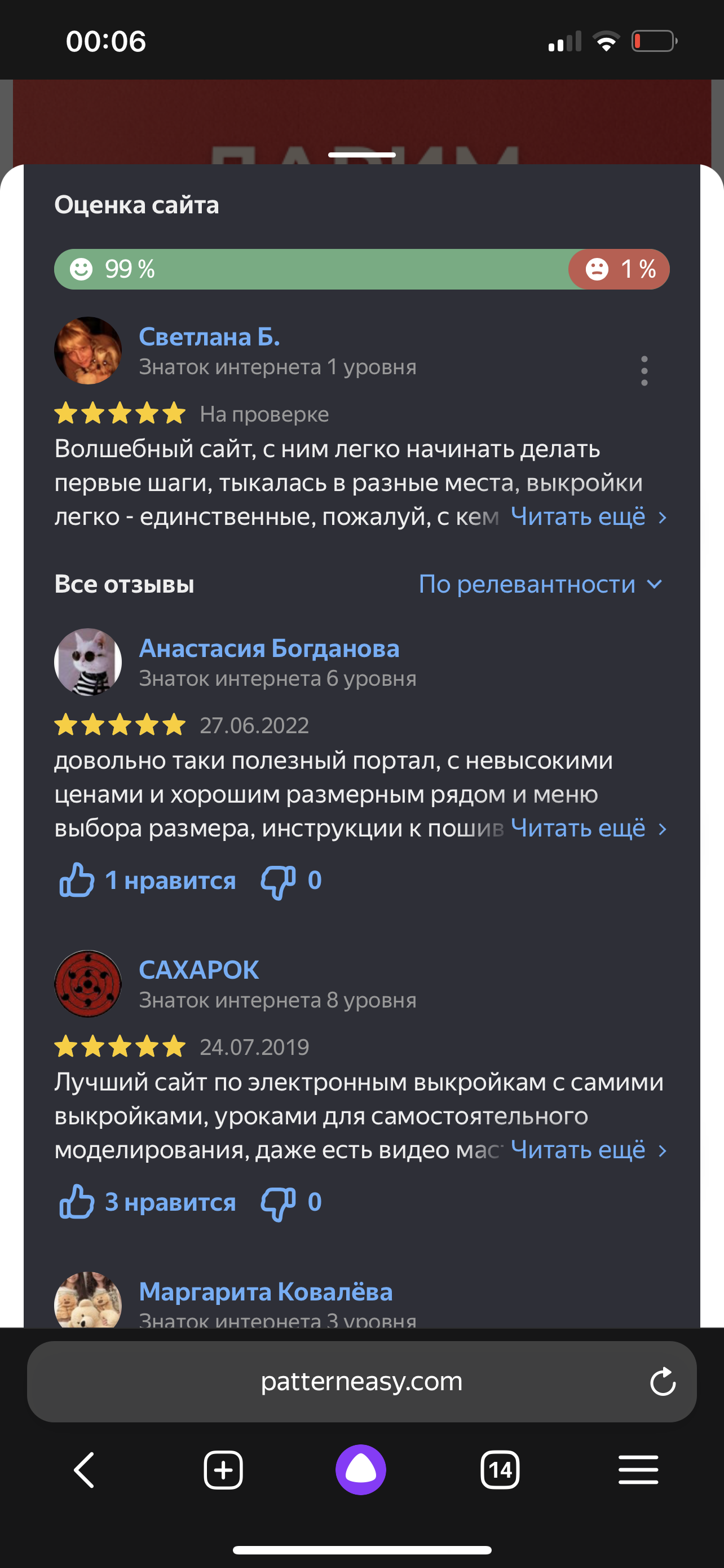 Здравствуйте. Если вы не можете скачать выкройку к себе на устройство, то проверьте сначала, установлена ли у вас программа для просмотра pdf файлов. Мы рекомендуем пользоваться Adobe Acrobat Reader. Если у вас в браузере стоит какой-то блокировщик или антивирус на компьютере, то посмотрите внимательно, не появляется ли каких-либо уведомлений о блокировании действия сайта при нажатии на кнопку "скачать". Если появляется, тогда вам нужно либо разрешить это действие либо временно отключить этот защитник. Это происходит потому, что скачивание файла выкройки происходит в новом окне браузера, а антивирус (блокировщик) блокирует их. Попробуйте поменять устройство. Мы рекомендуем пользоваться компьютером. Если у вас не открывается файл выкройки, то проверьте установлена ли на устройстве программа для просмотра pdf файлов. Мы рекомендуем пользоваться Adobe Acrobat Reader. Если не открывается на мобильном устройстве, то попробуйте поменять устройство, так как не все мобильники поддерживают наши файлы выкроек. Мы рекомендуем пользоваться компьютером.