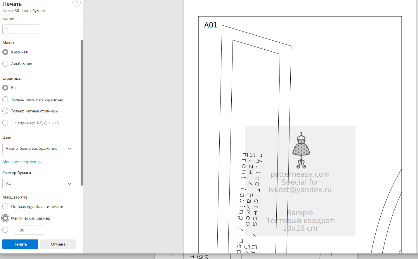 Здравствуйте. На базовые выкройки нанесена масштабная сетка с размерами ячеек 10х10 см. При печати ориентируйтесь на нее. Достаточно распечатать один лист выкройки и замерить ячейку, если размер ее ровно 10х10 см, значит параметры печати заданы верные и можно распечатывать остальные листы.