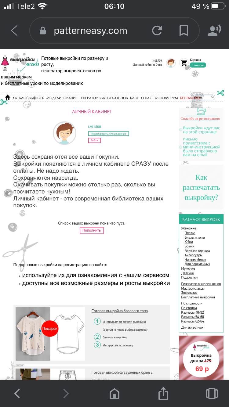Добрый день! В этом аккаунте вы зарегистрировались менее суток назад. Если Вы покупали эту выкройку раньше, то с другого аккаунта. Напишите номер заказа, подскажем, в каком кабинете у Вас эта выкройка.