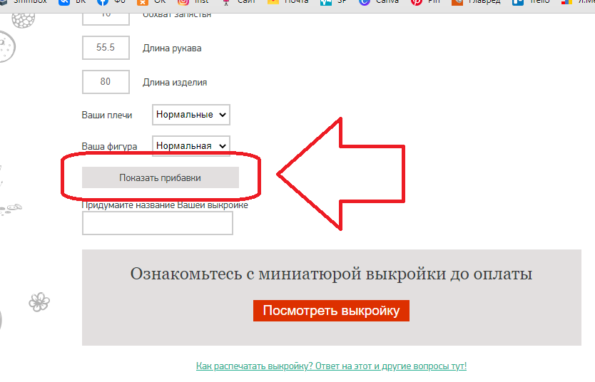 Добрый день! На странице генератора под формой ввода мерок нажимаете кнопку "показать прибавки" (см. скриншот). Если выкройку уже приобрели, то в личном кабинете - в файле под цифрой 1 "Инструкция по печати и мерки вашей выкройки"