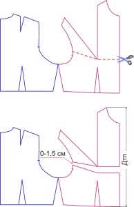 Добрый день! При большой разнице между мерками Дтс и Дтп рекомендуем ручную корректировку лекала. На этапе ввода мерок в генераторе необходимо ввести значение Дтп близкое к стандартному (либо заменить мерку в сгенерированной). Распечатать, а затем разрезать выкройку и поднять на недостающую величину, при этом дополнительно раскрывая нагрудную вытачку. При этом можно как совсем не удлинять пройму полочки, так и удлинить ее совсем немного (на 1,5 см) - это не потребует коррекции оката рукава.