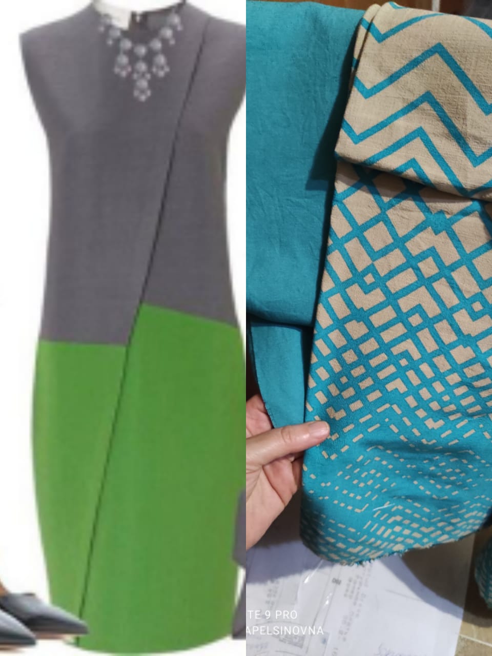 Ну и раз уж я тут с вопросами, можно еще один? Вот такое сочетание как вам для такого платья? Ткань лен с эластаном, мягкий. На фото цвет кажется голубым, но он бирюзовый. А какую ткань в данном случае сверху?