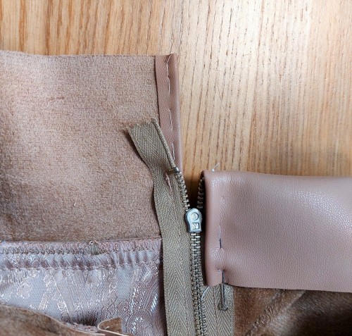 19. С изнаночной стороны наложите застёжку "молнии", как показано на фото. Наметайте. |