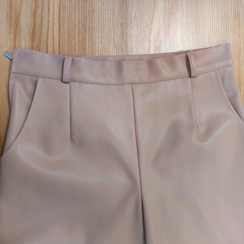 1. Наложите бочок брюк на лицевую сторону "мешковины кармана 1". Наколите, наметайте. Только сначала проверить на ненужном куске экокожи не остается ли от булавок дырки. У нас на материале не остаются, поэтому мы скалываем. Если остаются дырочки, то детали можно скрепить швейными или канцелярскими зажимами, или обычными бельевыми прищепками.