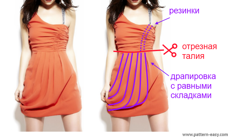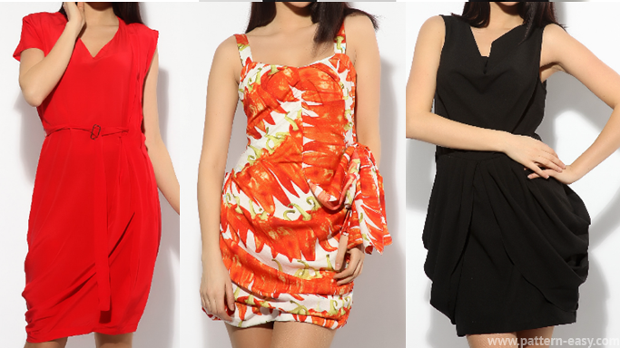 Или раскроить под драпировку только одну часть платья, например лиф. Сделать вот как в этих моделях – расширить лифовую часть платья – а потом сузить обратно, убрав все лишнее в сборочку-драпировку.
