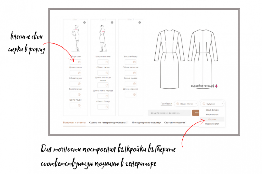 С готовыми выкройками мы разобрались: они строятся на типовые фигуры и мы их можем корректировать. Но! У нас на сайте есть уникальная возможность построить выкройку по индивидуальным меркам в генераторе выкроек-основ с учетом вашей осанки. Это супер опция, которая поможет избежать вам многих проблем при пошиве.