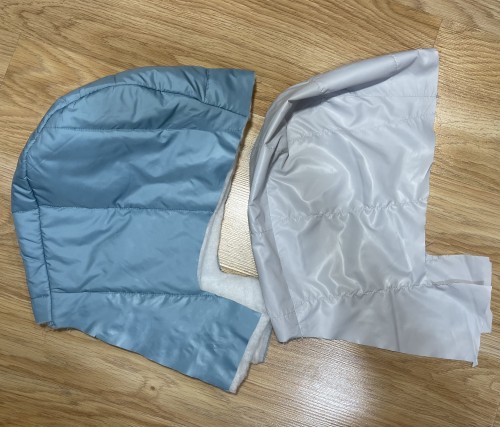 Обработка капюшона12. Раскроенные детали капюшона разделите на две части, на лицевую часть настрочите синтепон по намеченной линии стежки, также проложите декоративную строчку на нижних деталях капюшона по намеченной линии стежки. |