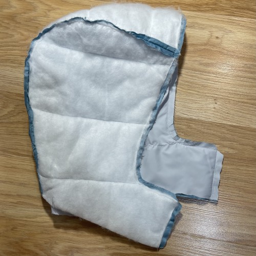 13. Боковые детали капюшона стачайте с центральной частью капюшона совмещая контрольные метки. Срежьте синтепон из швов верхнего капюшона, швы приутюжьте, а затем разутюжьте для удобства используйте портновскую колодку («окорок»). |
