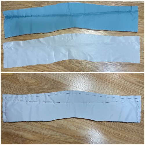 Обработка рельефного шва6. Сметайте рельефные швы совмещая контрольные метки, бейку наложите на припуски и выровняйте срезы. Закрепите бейку портновскими булавками, а затем приметайте её, проложите строчку шириной шва 10 мм. Обрежьте синтепон в шве, ширину шва подрежьте на 2-3 мм. Шов приутюжьте. |