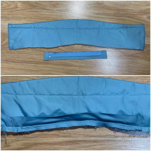 16. Совмещая срезы приметайте к нижнему срезу капюшона бейку и проложите строчку шириной шва 10 мм от среза (для удобства используйте лапку для притачивания молнии). Шов приутюжьте. |