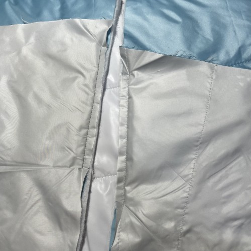 Обработка низа изделия.31. Бейку наложите на низ изделия выровняйте срезы. Закрепите бейку портновскими булавками или сметайте. Притачайте бейку шириной шва 10 мм от среза, шов приутюжьте, синтепон в шве срежьте, припуски на шов срежьте на 2 мм, бейку заутюжьте на припуски. |