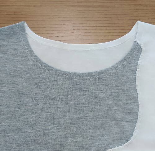 Соединение плечевых срезов10. Лицевыми сторонами внутрь сложите детали переда и спинки. Уравняйте плечевые срезы, сколите, сметайте. |