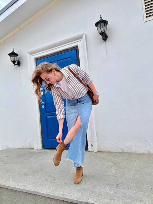 На фото — джинсы, которые превратились в юбку. Перешивала свои старые штаны наш стилист Ксения под руководством портного-технолога Розы.