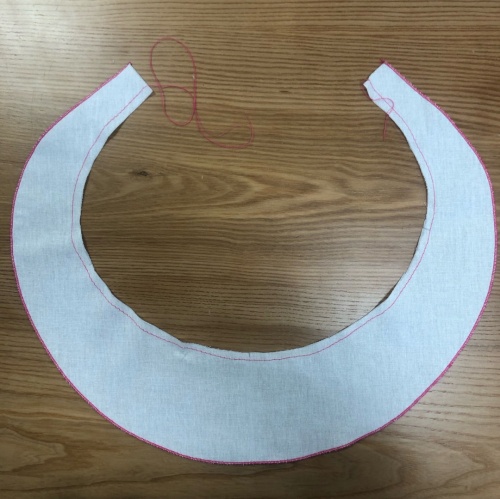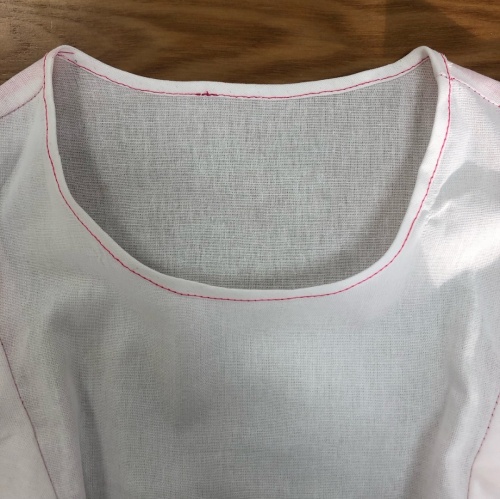 16. Закройте косой бейкой срез горловины, заметайте и стачайте на 1-2 мм от края. Приутюжьте. |
