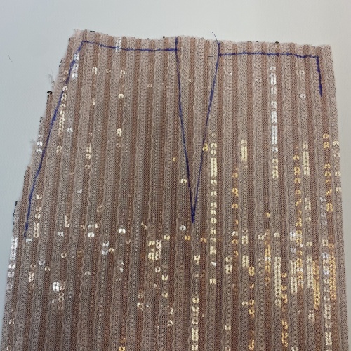 5. На детали спинки юбки аккуратно срежьте пайетки на месте вытачки, строго до намеченных линий. |