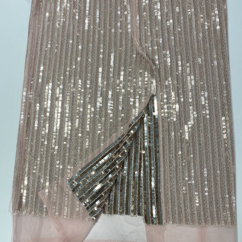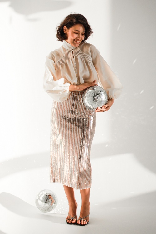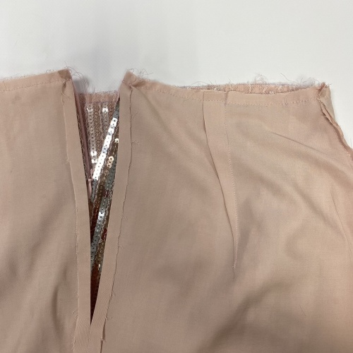 33. Сложите лицевыми сторонами внутрь основные детали шлицы юбки, уравняйте нижние срезы, сколите, сметайте, стачайте шириной шва как можно ближе к пайеткам. Приутюжьте. |