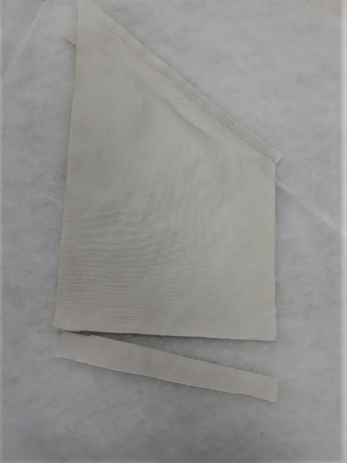 7. С лицевой стороны полочки на нижнюю обтачку кармана приметайте мешковину кармана, как показано на фото. |