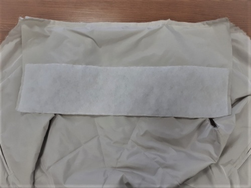 Соединение утеплителя с деталями верха3. Наложите утеплитель спинки и полочки. Наколите, как показано на фото. Затем наметайте. |