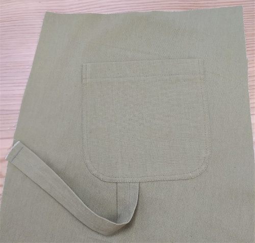 12. Подложите деталь петли кармана под правый карман. Настрочите карман. Первая машинная строчка от края 1 мм , вторая от края 5 - 6 мм. Приутюжьте. |