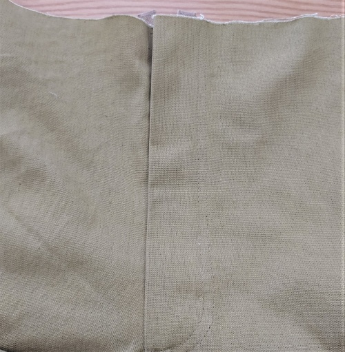 22. Сложите переднюю и заднюю половинки лицевыми сторонами внутрь. Уравняйте шаговые срезы. Сколите, стачайте, шириной шва 10 мм. Срезы обметайте. Приутюжьте и заутюжьте на заднюю сторону. |