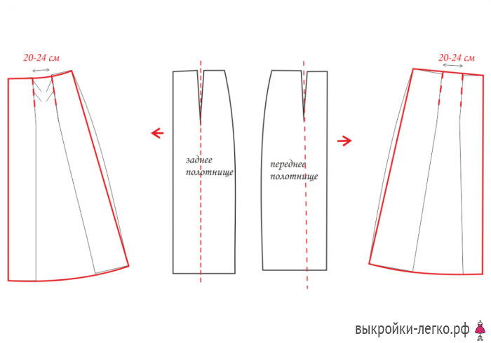 6. Промоделируйте заднее полонище юбки. Для этого разрежте выкройку заднего полотнища вдоль и раздвиньте к низу на 13-20 см.