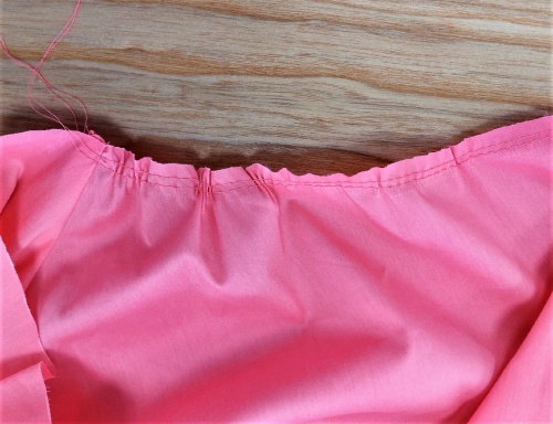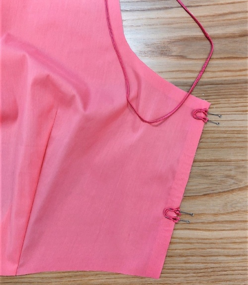 22. Дойдя до боковых швов, закрепите конец шнура машинной строчки, тройным обратным стежком. |