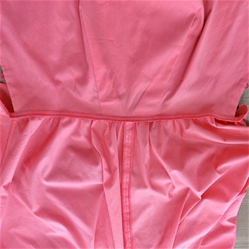 17. Соедините лиф с юбкой лицевыми сторонами внутрь. Сколите, совмещая боковые швы лифа и юбки , а также контрольные метки (середина лифа) со средним швом юбки. Притачайте, шириной шва 10 мм. Срезы обметайте, одновременно обметайте срез талиевого припуска заднего полотнища юбки. Приутюжьте. |