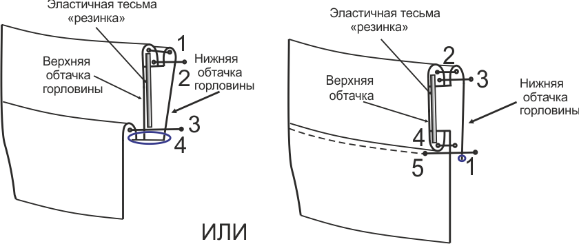 21. Закрепите эластичную тесьму «резинка» по боковым швам обтачки горловины.