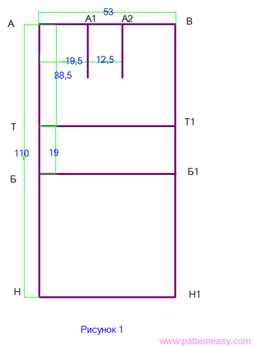 От точки А вправо отгладываем величину полуобхвата груди с прибавкой на свободу (Например: АВ = ПОГ + Пр=48+5=53см.). Ставим точку В. От В вниз проводим линию, до пересечения с нижней линией и ставим точку Н1.