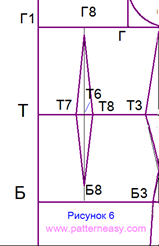 Начинаем построение вытачки на полочке. От точки Г6 вниз проводим линию до пересечения с линией ББ1. Пересечения с линиями ТТ1 и ББ1 обозначаем Т9 и Б7.