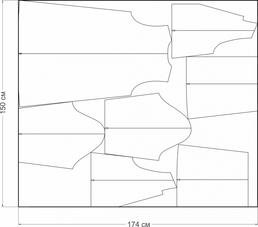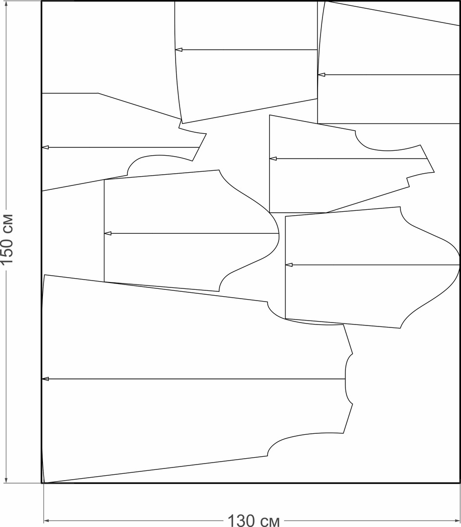 Расход основного материала от 2,5 до 4 м (зависит от размера и роста). При определении расхода материала посмотрите внимательно на схемы раскладок, которые показаны на рисунках. Эти схемы помогут определить расход материала на ваш размер с учётом ширины материала.