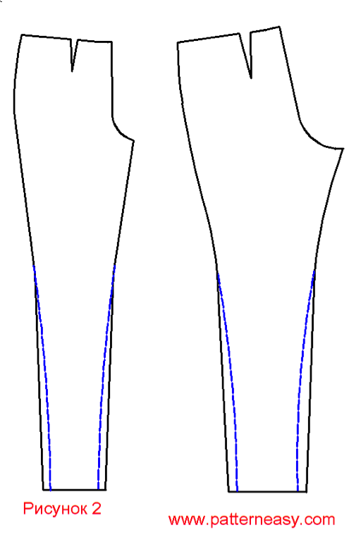 Рисунок 2: Заужаем брючины по низу на желаемую величину (синие линии). Плавные линии нужно начать выводить чуть выше уровня колена.