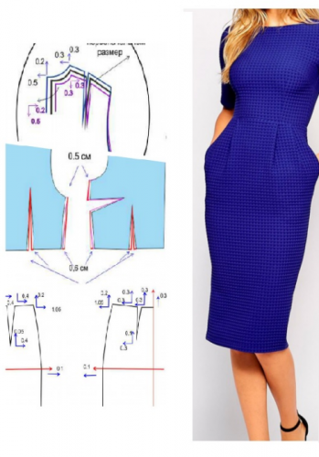 Рисунок 3: Теперь сделаем обтачной пояс по верхнему срезу брюк (синие линии).Ширину выберем около 5 см. На передней и задней половинках брюк оставляем вытачки для хорошего прилегания по талии. На поясе мы их убираем.