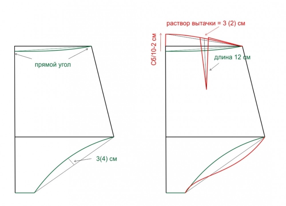 - перевести вытачки в рельефные швы, просто продлив линию от вершины вытачки вниз и разрезав (смотрите на мой рисунок),