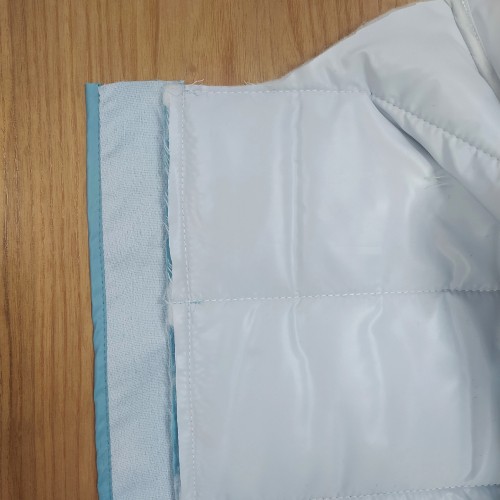 Обработка низа42. Наколите лицевой стороной косую бейку на низ изделия. Приметайте. Притачайте шириной шва 10 мм от среза. Подрежьте синтепон на припусках. |