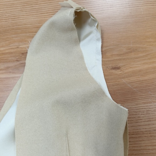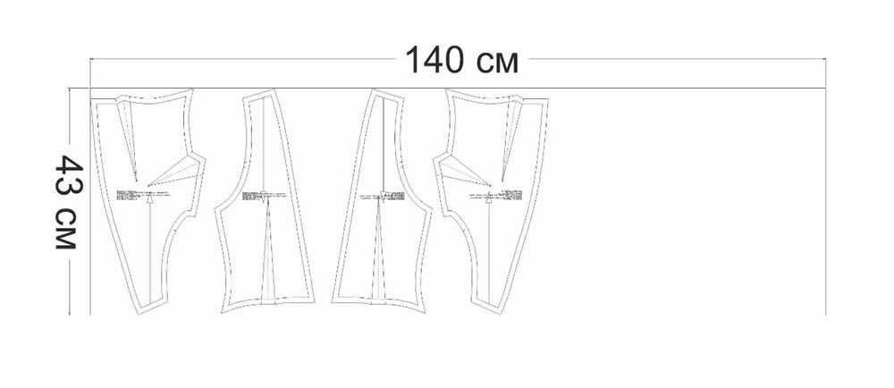 13. Лицевыми сторонами внутрь сложите детали переда и спинки подкладки. Уравняйте плечевые и боковые срезы. Сколите, сметайте, стачайте шириной шва 10 мм. Приутюжьте и разутюжьте припуски. |