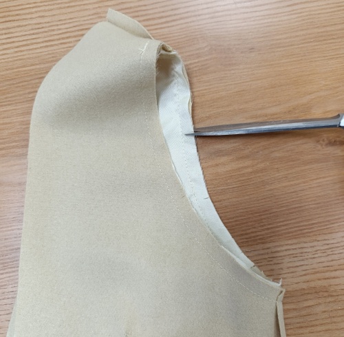 Соединение подкладки с лифом изделия14. Лицевыми сторонами внутрь соедините пройму изделия лифа и пройму подкладки лифа. Уравняйте срезы, сколите. Стачайте и приутюжьте. |