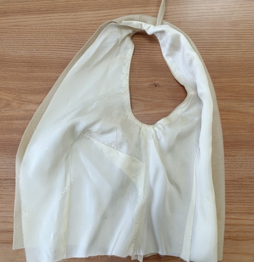 19. В два этапа обработайте подкладкой лиф изделия. Сначала лицевыми сторонами внутрь соедините центральные срезы лифа спинки с подкладкой, от низа до плечевого шва. Сколите, сметайте, стачайте шириной шва 10 мм. Приутюжьте шов. |