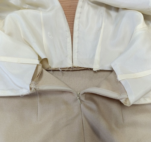 Обработка застежки-молнии8. Укрепите клеевой кромкой припуски втачивания молнии на средних срезах юбки спинки. Обметайте средние срезы юбки спинки. |