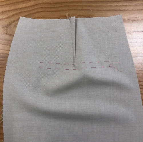 26. Лицевыми сторонами внутрь сложите детали, уравняйте срезы и сметайте. Стачайте средний шов шириной шва 10 мм, как на фото. Припуски разутюжьте. |
