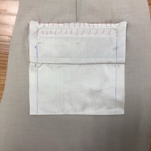 15. Настрочите деталь мешковины с лицевой стороны по верхней линии расположения кармана. Строчка должна начинаться и заканчиваться по намеченным линиям и быть параллельна строчке настрачивания листочки.