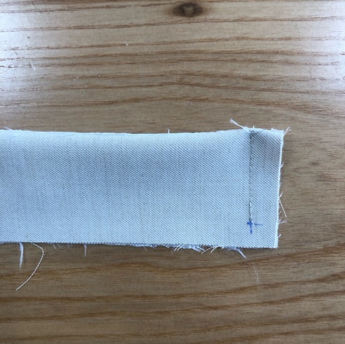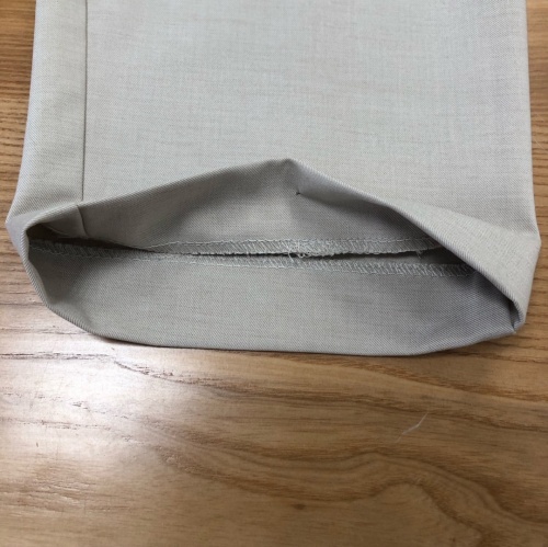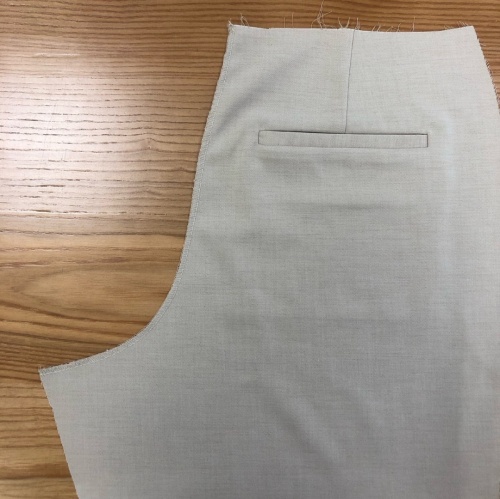 12. Также укрепите вход в задний карман клеевой прокладкой для предотвращения растяжения материала с изнаночной стороны задних половинок брюк. |
